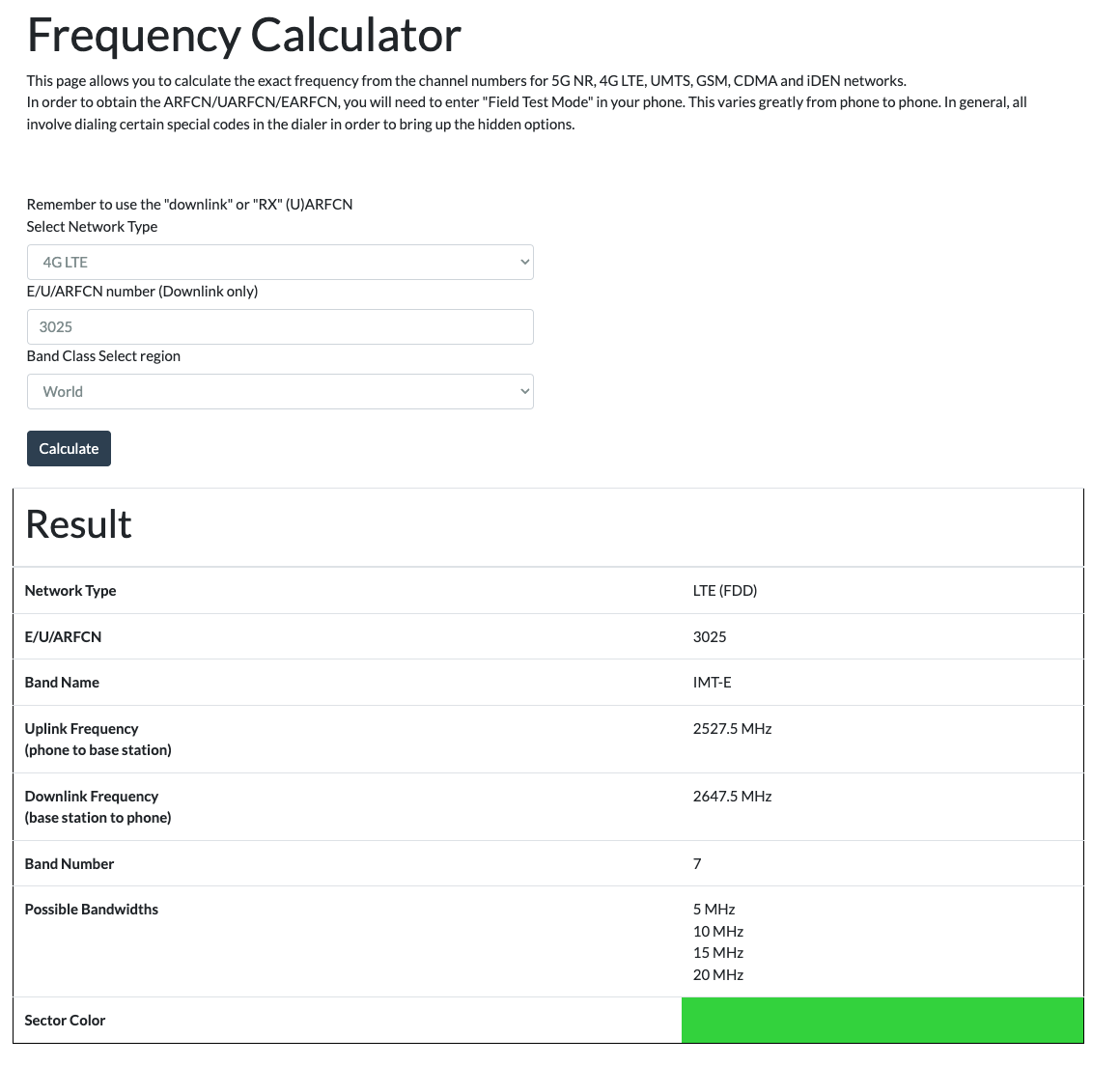 Visit the CellMapper frequency calculator. Select your network type (e.g., 2G, 3G, 4G, 5G) and enter the E/U/ARFCN number (downlink only) from your phone test.